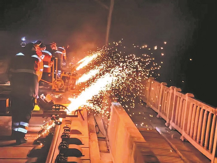 To improve passenger travel comfort and enhance the quality of track equipment, work crews from the Jinanxi Track Maintenance Section of CR-Jinan operate manually controlled rail grinding machines weighing more than 300 kilograms, carrying out precision operations with only millimeters of tolerance against the steel rails.