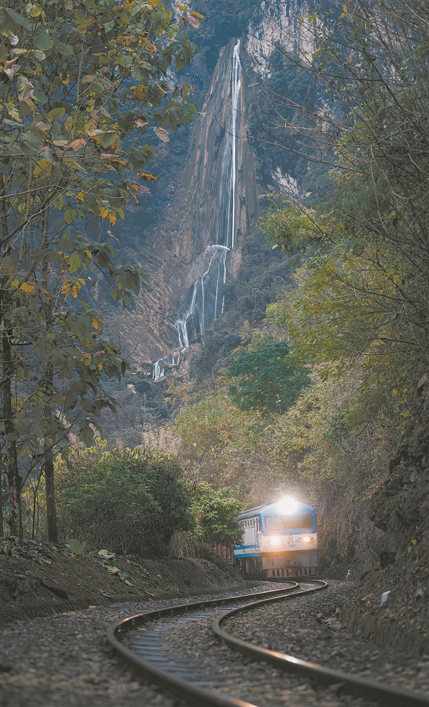 故事:昆河鐵路在山腰盤(pán)旋,途經(jīng)一處彎道時(shí),正好與一條銀絲帶般的高山瀑布同框