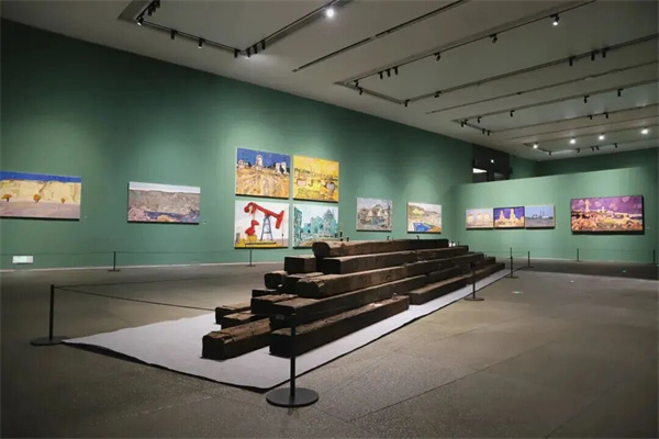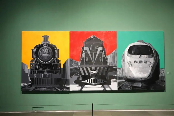 序廳以《奔騰·歲月》開(kāi)篇,描繪中國鐵路發(fā)展的重要階段。作品中的機車(chē)主體以黑、白、灰為主色調,盡顯硬朗雄厚的力量感;而背景的紅、黃、綠三種高飽和度純色,則為機械的冰冷感賦予了強烈的當代視覺(jué)沖擊力。觀(guān)眾得以從中國鐵路的巨變中,真切感受到中國的飛速發(fā)展和時(shí)代變遷。