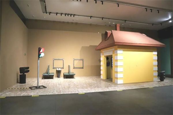 展廳中,一件名為《站臺》的大型裝置作品尤為引人注目。作品以東北地區火車(chē)扳道房為原型,淺紅褐色屋頂與赭石色墻體復刻了工業(yè)記憶,地面如白雪覆蓋,搭配綠皮火車(chē)座椅、茶幾與模擬車(chē)窗,再輔以信號燈的光影點(diǎn)綴,讓每一位觀(guān)眾都能成為這段旅途中的風(fēng)景,完美詮釋了“場(chǎng)域性景觀(guān)”的藝術(shù)構想。