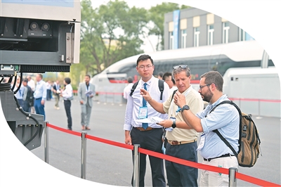 7月9日,第十二屆世界高鐵大會(huì )“高鐵創(chuàng )新之旅”活動(dòng)現場(chǎng),參會(huì )代表在室外實(shí)車(chē)展示區進(jìn)行觀(guān)摩。王 瑋攝(人民圖片)
