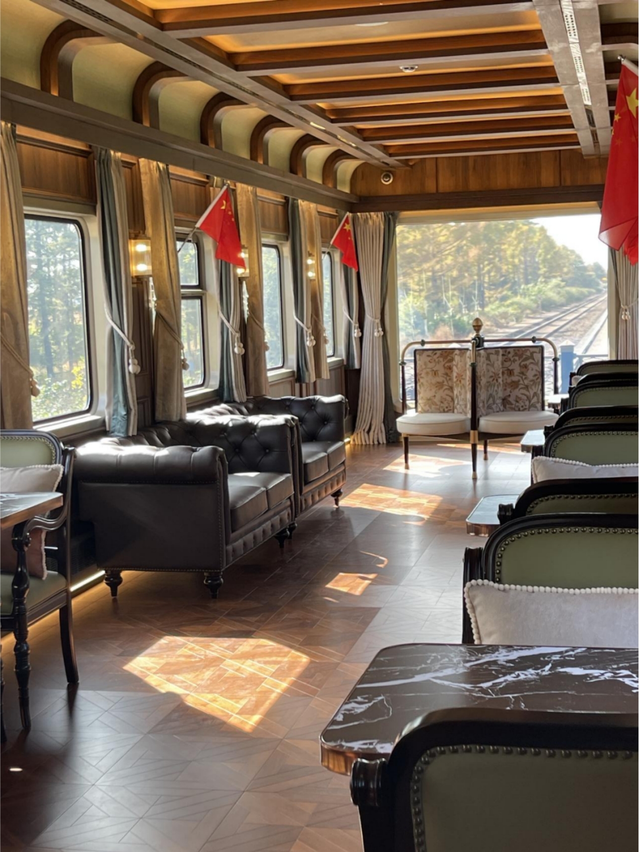 10月1日上午,哈爾濱站14站臺國旗飄揚、花團錦簇,在《伊人之春》、《我在黑龍江等你》等悅耳的音樂(lè )聲中,“伊春號”旅游列車(chē)首發(fā)式成功舉行,來(lái)自全國各地以及新加坡、泰國、臺灣等地的200余中外游客齊聚冰城,開(kāi)啟“游千里畫(huà)廊,賞最美五花山”浪漫之旅?!耙链禾枴?/span>極具特色,外觀(guān)輕奢復古風(fēng)格,車(chē)身主體顏色為深海藍和珍珠金,車(chē)頂的白色突出亞冬會(huì )冰雪主題,無(wú)論是行進(jìn)在“綠水青山”,還是“冰天雪地”間,都極具辨識度。列車(chē)整列編組11輛,最大亮點(diǎn)是其觀(guān)光車(chē)的設計,其中5輛休閑娛樂(lè )觀(guān)光車(chē)是根據“行走的敖麓古雅”“紅堡之夜”“金海岸漫步”“撒哈拉故事”“浪漫的溫哥華個(gè)大洲文化特色和建筑風(fēng)格設計;有2輛多功能觀(guān)光車(chē)首創(chuàng )全景式觀(guān)光車(chē)廂和懷舊式旅拍車(chē)尾,視野極為開(kāi)闊,給游客們帶來(lái)全新的觀(guān)景體驗。